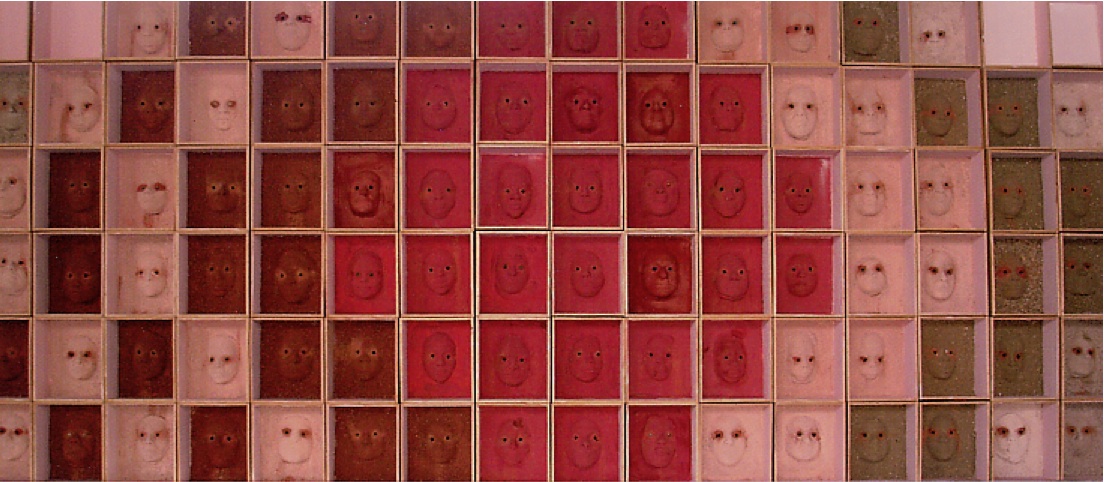 La cohérence profonde de l’œuvre récente d’Olga Luna s’affirme dans une mise en rapport subtile des masques et regards, murs et visages. Nous sommes en permanence au « Seuil du vide », (pour reprendre le titre du roman de Kurt Steiner/André Ruellan), dans l’acte de création qui ne peut exister que par la claire conscience du néant. Le projet international d’action artistique en faveur de l’intégration sociale, Le Mur – Art en Action, d’Olga Luna ne s’apparente pas à une simple animation, mais s’énonce pratiquement comme une démarche consubstantielle à l’œuvre. Après Lima (Pérou, 2002), cette création originale a pris la forme d’un projet pédagogique à l’Espace Tisot (La Seyne-sur-Mer) entre février et juin 2005. Les intervenants ? Des enfants des ateliers, des comédiens de la compagnie Attention Fragile (alors en résidence), des animateurs du Service Jeunesse, le personnel du centre, des jeunes en stage d’écriture rap avec le groupe l’Infanterie, des amis fidèles de la structure : Louis, Nazim, Eddy, Leila, Séréna, Gisèle, réunis et motivés par Mireille Odin, directrice du lieu et coordinatrice du projet. Diversité donc, des parcours, des âges, des visages. Ces visages qui doivent être recouverts, sous la férule d’Olga Luna et avec l’aide d’Hichem, Joyce, Stella, Pauline, Sarah, d’un masque de plâtre. Un masque de beauté, de théâtre, funéraire. Un linceul éphémère pour des gisants provisoires. Une expérience plastique, charnelle, suscitant échanges et confidences. Un révélateur. La deuxième étape fera l’objet d’un stage pour enfants et adultes, autour du travail de la terre, toujours sous sa direction, assistée d’Hichem Benamara, et bien-sûr Jessica Bédouet. Les visages d’argile seront réalisés à partir du moule en plâtre, et insérés dans des boîtes comme autant d’alvéoles permettant au mur de prendre forme et sens.